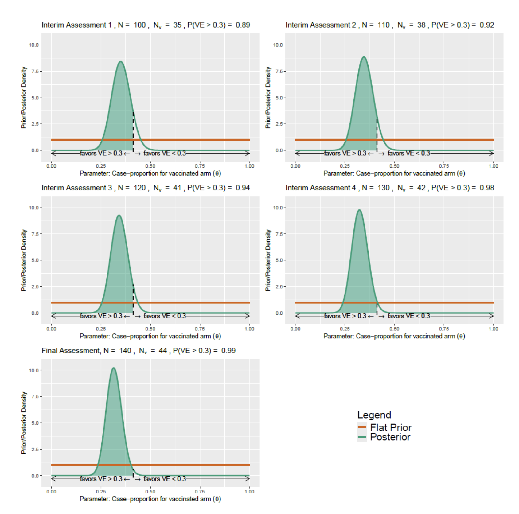 Next, I was asked to work on a number of graphics to illustrate some statistical concepts for Rajat’s work communicating study design to clinicians. I was asked to create a graphic in R using ggplot, showing how the posterior probability of a hypothesis that a vaccine has a given efficacy (or greater) would evolve as a function of sample size. Interim assessments to trial data are a key element of much of the consulting work at MuSigmas in order to decide on possible prespecified changes to the design (early stopping for futility/efficacy, increase sample size, enrich population, etc.) is an exceptionally useful strategy in drug development.