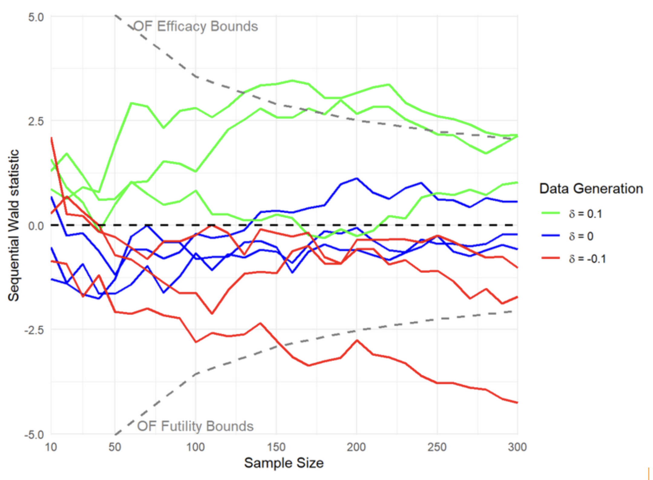 Whilst we waited for responses to our questions about the data set, Rajat asked me to visualise a graph of how a Wald-type test statistic would develop over sequential interim looks as a study took place in three scenarios: Where the probability of a response from treatment was 0.1 higher than the control, where the probability was the same, and where the probability was 0.1 lower. Theoretically, the test statistic should follow Brownian motion. I graphed this three times for each scenario, with a final sample size of 300 in each. We also added efficacy and futility bounds derived using the/an O’Brien-Fleming type alpha-spending function, whereby a study would be stopped if the test statistic crossed those bounds, with the bounds becoming less extreme as the sample size increased. There are various alpha-spending functions that are in use in order to protect from type-I error inflation that would otherwise happen due to testing the same hypothesis multiple times with evolving data.