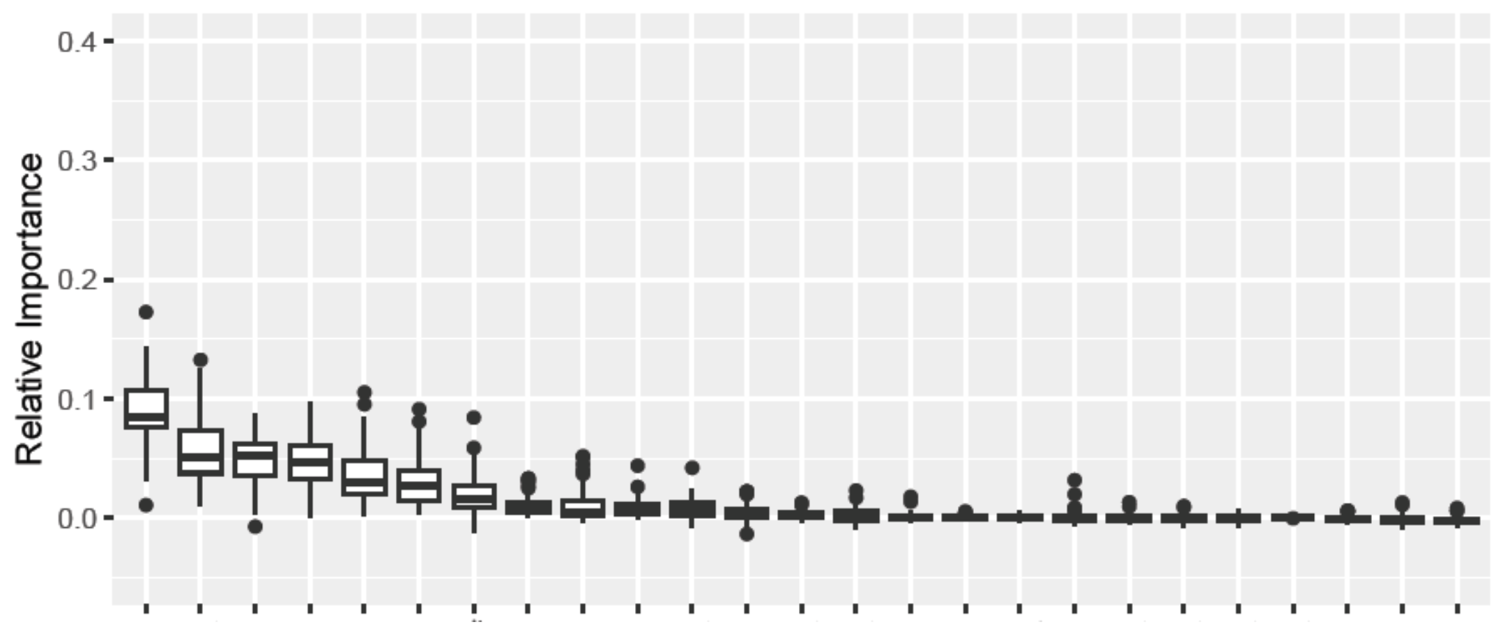 A key element of the model was our test-training split. We split the test and training data into a 30:70 ratio but, in order to avoid the peculiarities of any one particular split affecting our result, averaged our results over many hundreds of trials – each boxplot in the graph above is a variable-wise distribution of the importance measure across these random data partitions.